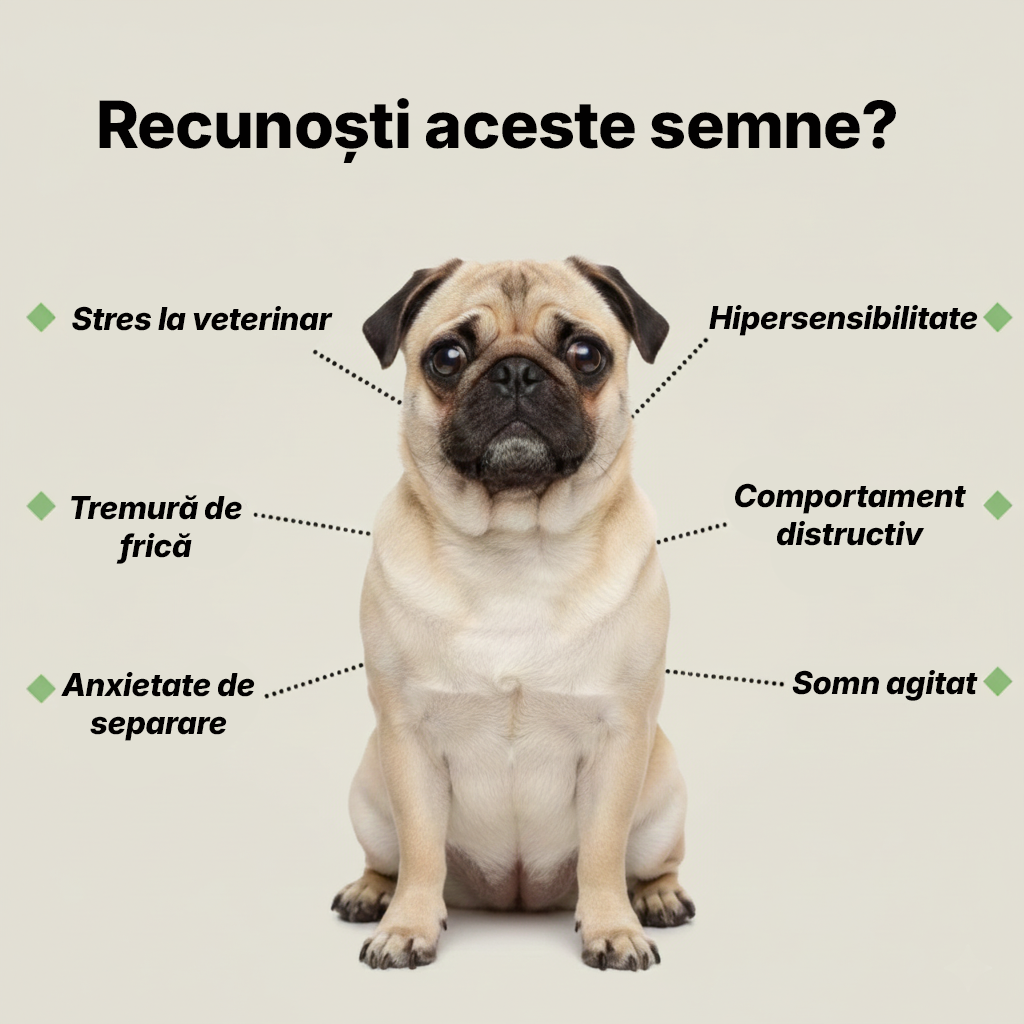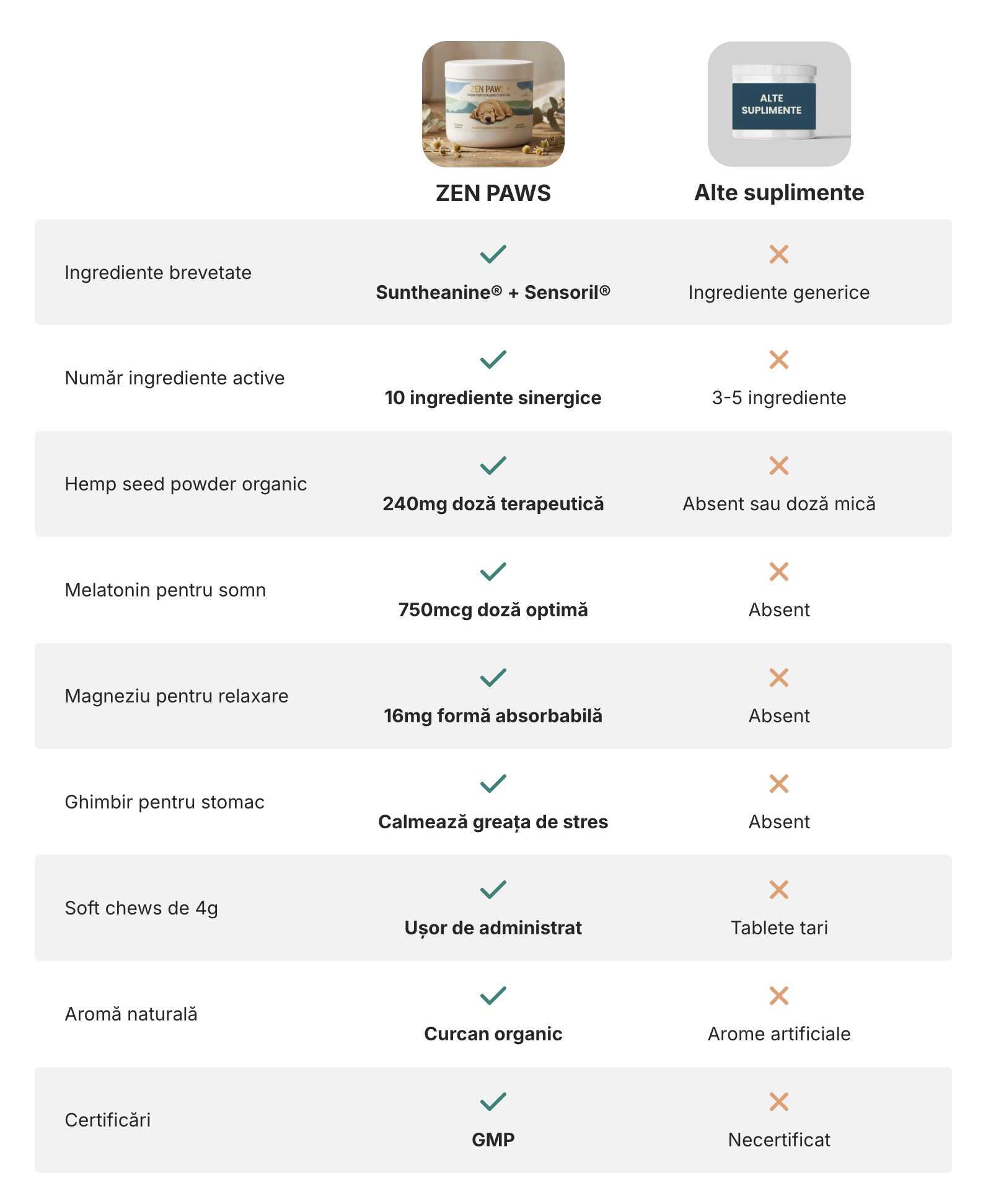 "Ceea ce diferențiază acest produs este utilizarea de extracte standardizate brevetate precum Suntheanine® și Sensoril®, care au studii clinice concrete în spate. Nu sunt doar ingrediente generice. Anxietatea afectează calitatea vieții câinelui mai mult decât realizează majoritatea stăpânilor. Această formulă abordează problema la nivel neurologic - GABA, serotonină, cortizol - nu doar maschează simptomele. E diferența dintre a suprima și a vindeca."